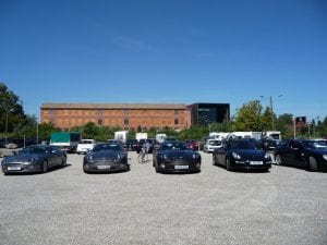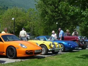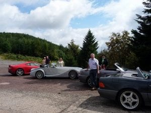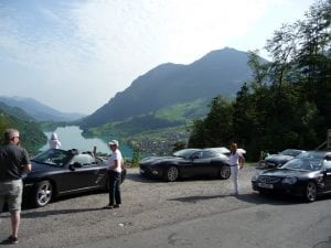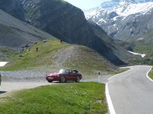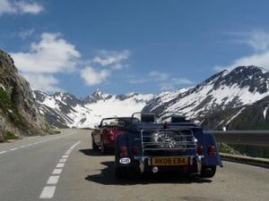 At Gletch we turn right and drive down a scenic valley to Brig and then up the Simplon Pass where we enjoy lunch on the summit, (see photos of cars below).